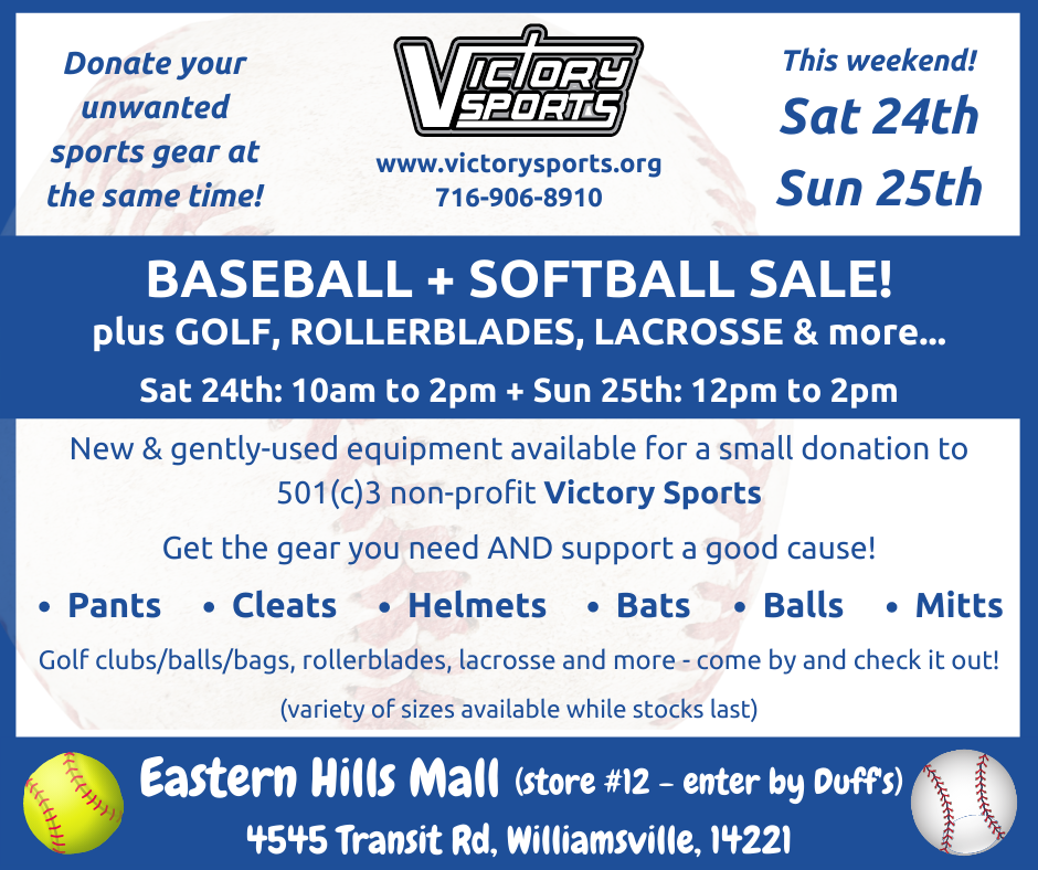 DetailsEquipment sale for youth baseball and softball seasons March 27 + 28 Saturday 10-2 + Sunday 12-3 Eastern Hills Mall, Williamsville, 14221 Store #12 on the floorplan – enter by…